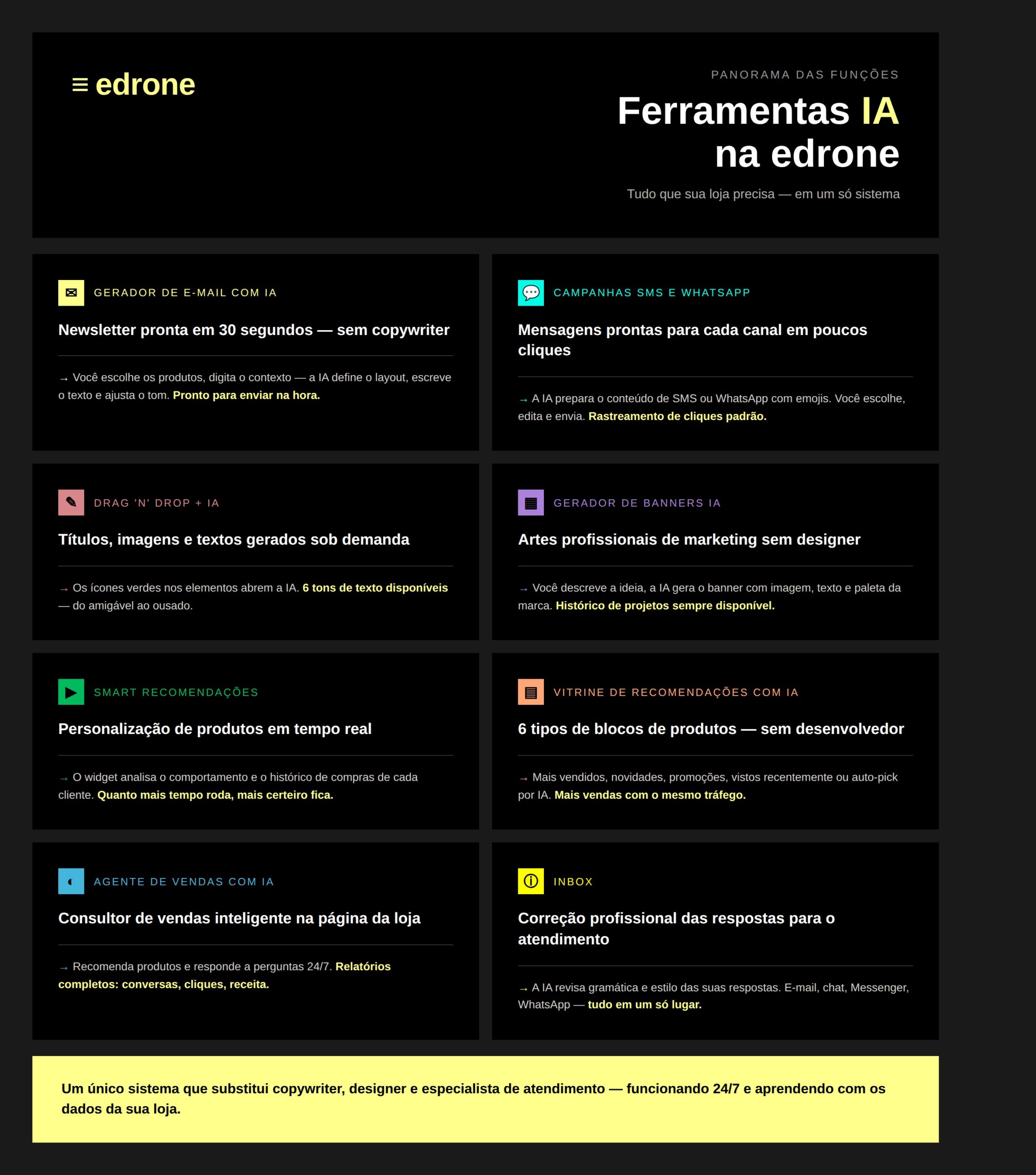A edrone reúne em um único sistema um conjunto completo de ferramentas de IA para e-commerce: Gerador de E-mail com IA (newsletters prontas em segundos), geração de campanhas de SMS e WhatsApp, editor Drag ‘n’ Drop com IA para criar títulos, textos e imagens sob demanda, Gerador de Banners com IA, Smart Recomendações e Vitrine de Recomendações com IA para personalizar a oferta na loja, Agente de Vendas com IA como consultor de vendas na página, e Inbox com correção de texto via IA no atendimento ao cliente.